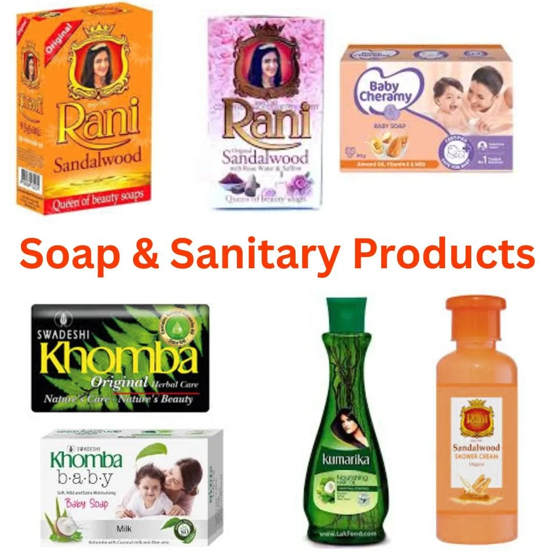 Collection of soap and sanitary products including Rani sandalwood skin care soap, Baby Cheramy soap for babies, Swadeshi Khomba herbal care soap, Swadeshi Khomba baby soap, Kumarika herbal hair oil, Rani sandalwood shower cream.