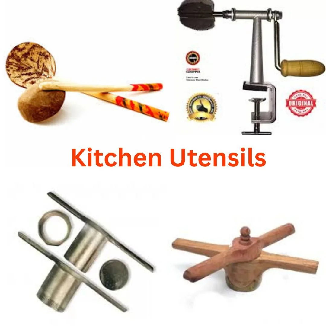 A collection of kitchen utensils including matches, a meat grinder, a wooden printing press, and a wooden toast rack, with the text 'Kitchen Utensils' in bold red letters in the center.
