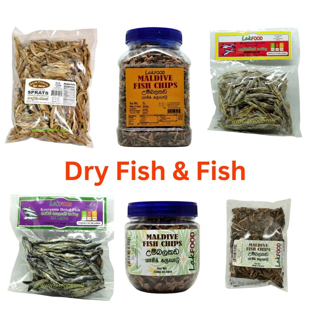 Assorted packages of dried fish and fish chips from different brands with the text 'Dry Fish & Fish' in red in the center.