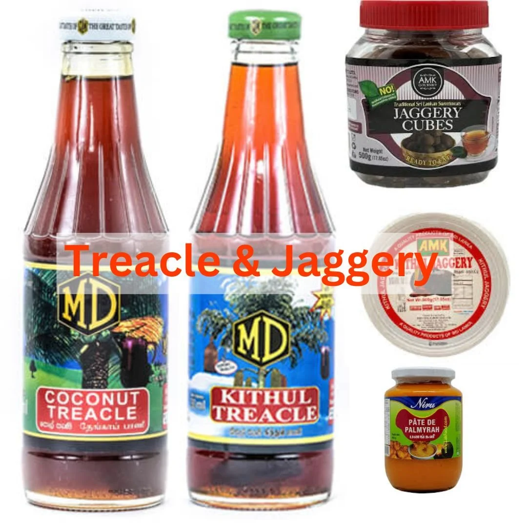 Bottles of Treacle, jars of jaggery cubes, coconut treacle, kati treacle, and palm syrup. Text overlay reads "Treacle & Jaggery".