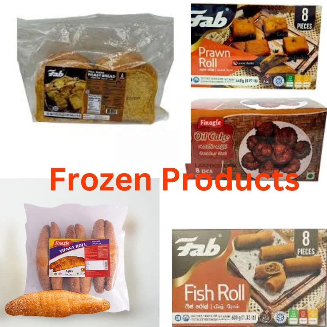 Frozen assorted snack products including chicken nuggets, prawn rolls, fish rolls, Vienna sausages, and fried chicken drumsticks.