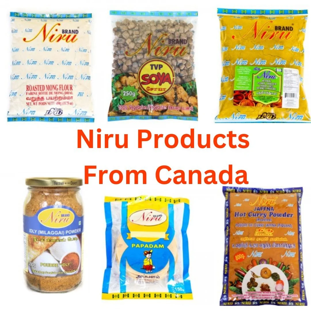 A collection of Niru Indian food products from Canada, including roasted mong flour, TVP soya chunks, spicy curry powder, idly powder, papadam, and hot curry powder, all displayed on a white background with the text 'Niru Products From Canada' in red.