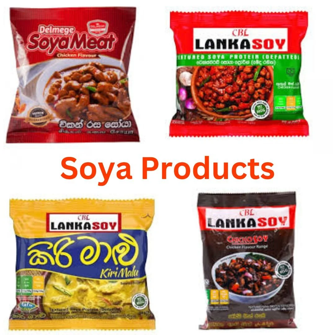 Four different packages of Soya products from Sri Lanka, including soy meat, soy chunks, soy noodles, and soy curry, with the text 'Soya Products' in orange in the center.