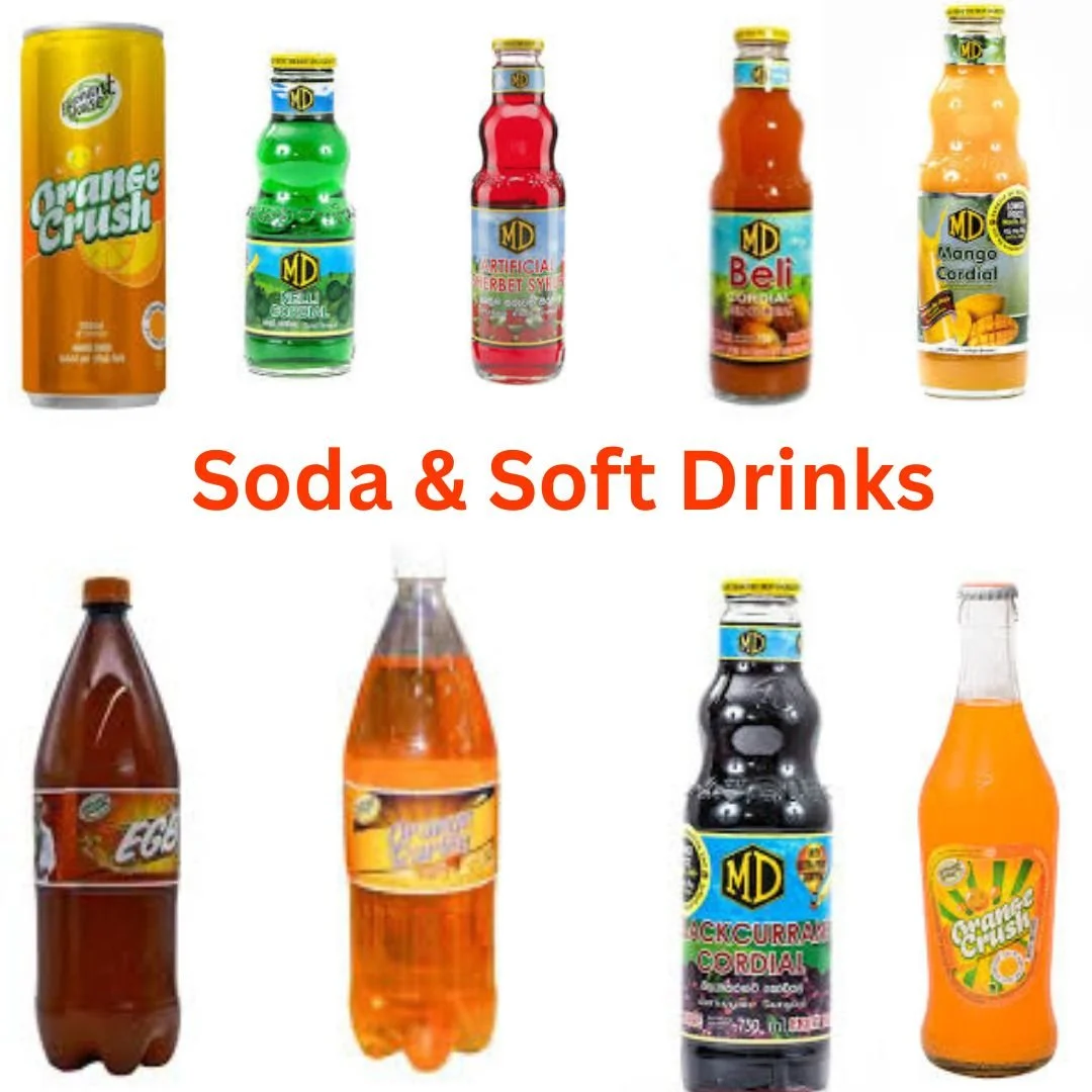 A collection of various soda and soft drink bottles and cans arranged in two rows, with the text "Soda & Soft Drinks" in the center.