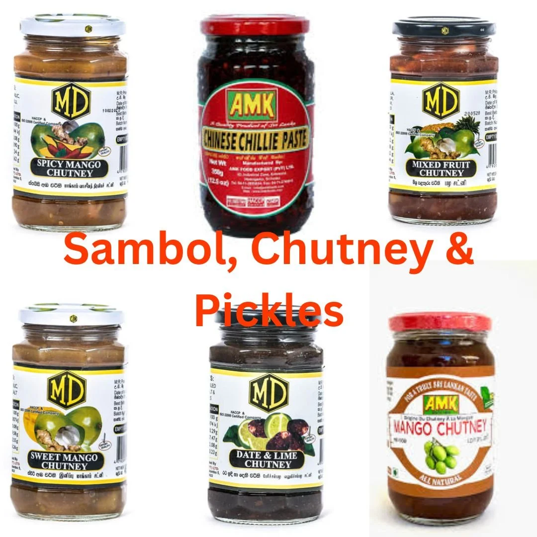 Various jars of sambol, chutney, and pickles, including spicy mango chutney, Chinese chili paste, mixed fruit chutney, sweet mango chutney, date and lime chutney, and mango chutney, arranged with text 'Sambol, Chutney & Pickles' over the image.