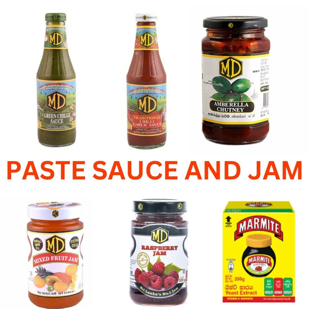 A collection of sauce bottles and a jar, including green chili sauce, traditional chili garlic sauce, ambarella chutney, mixed fruit jam, raspberry jam, and Marmite yeast extract, with the text 'Paste Sauce and Jam' in bold red letters.