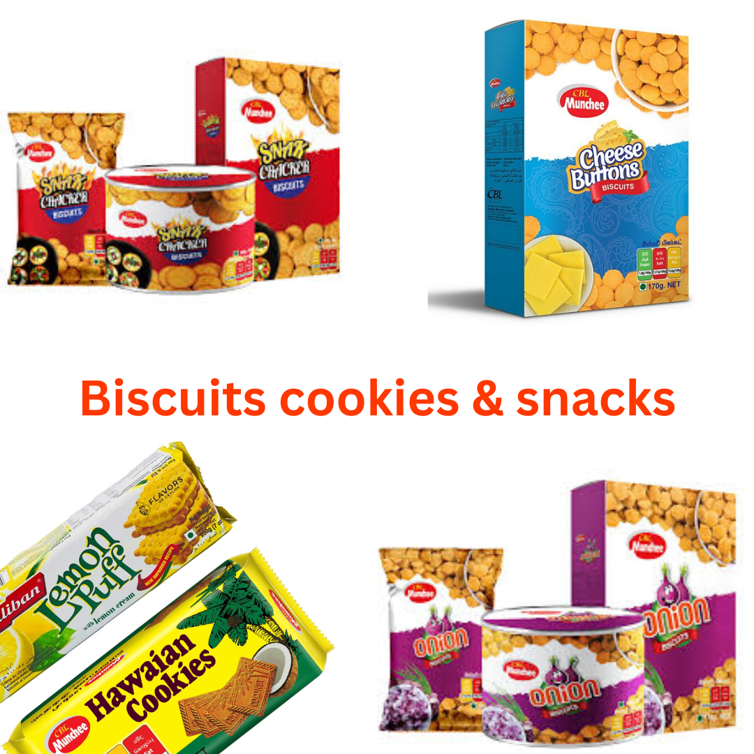 An assortment of snack products including cheese-flavored biscuits, onion-flavored biscuits, Hawaiian cookies, lemon-flavored cookies, in colorful packaging labeled with the brand CBL Munchee, with text 'Biscuits cookies & snacks' in orange in the center.