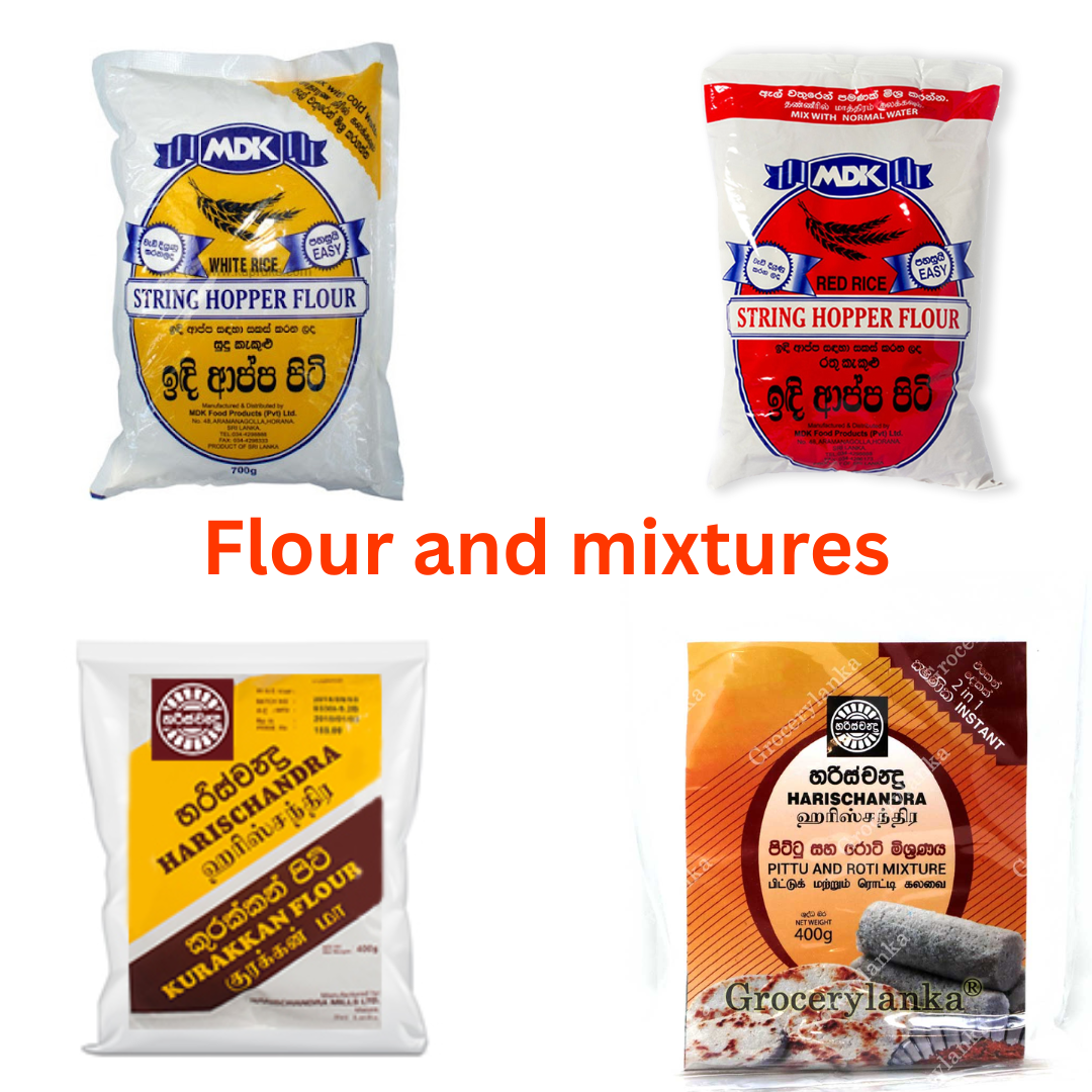 Four different types of flour packages, each labeled for specific varieties such as white rice, red rice, kurakkan, and pita and roti mixture, with the words "Flour and mixtures" in bold red text in the center.