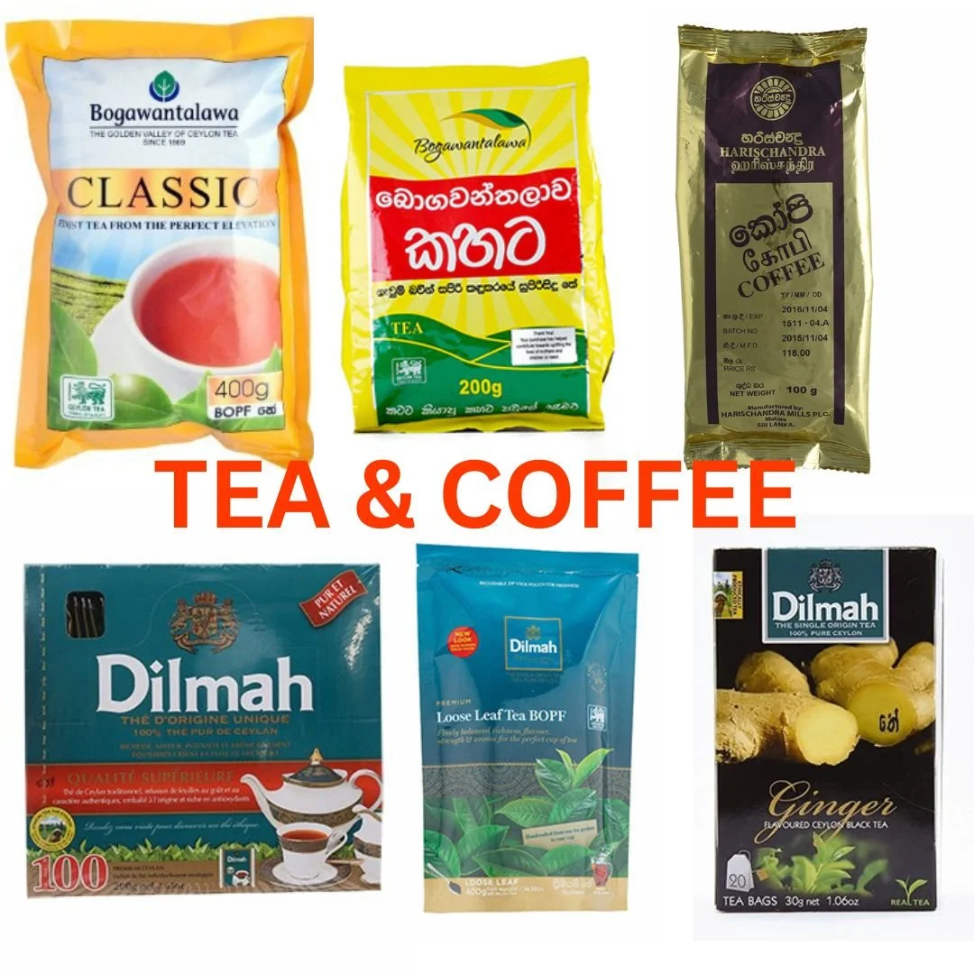 Assorted tea and coffee packages including Bogawantalawa and Dilmah brands.
